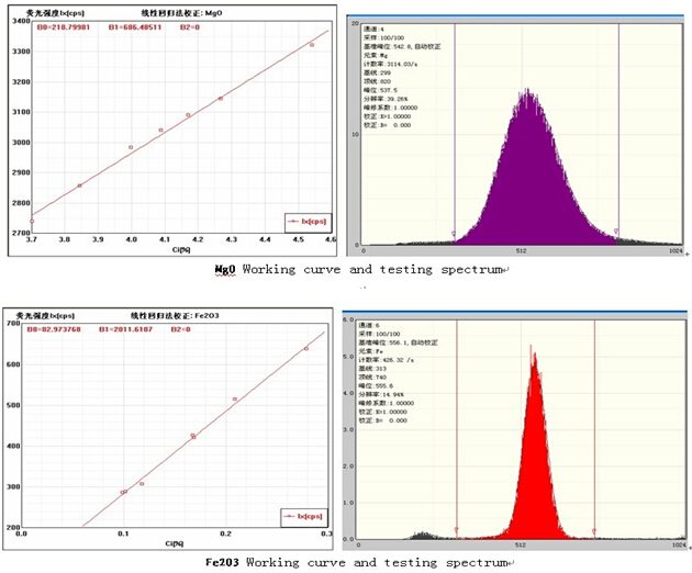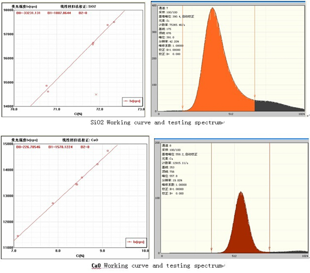 Working curve and test spectrum of every element, among B0 is curve pitch; B1: curve slope; test information in the spectrum: count rate, sampling time and resolution, etc.